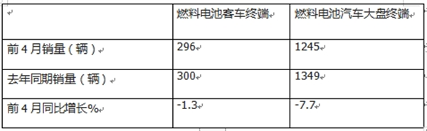 今年前4月燃料电池客车终端市场同比增速跑赢燃料电池汽车大盘,据分析主要是去年同期销量基数也不高,与今年前 4月差距不大。实际上今年前4月无论是燃料电池客车及燃料电池汽车大盘终端市场表现均较低迷,具体原因上文已经简析。