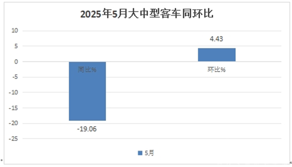 根据国家统计局数据,2025年5月我国制造的PMI指数为49.5%,,虽然市场需求仍然处于“荣枯线”以下的萎缩区间,环比上月的49%提升了0.5个百分点,可见今年5月市场大环境比上月要好,意味着今年5月各行业对大中型客车的需求动力环比上月增强。