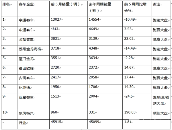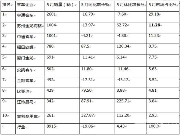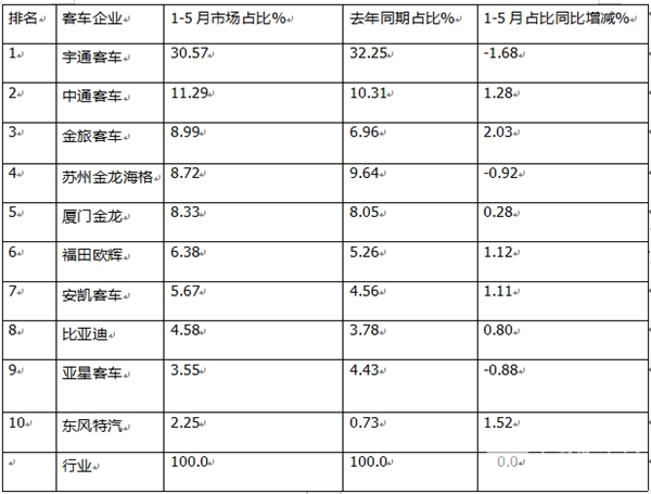 总之,今年前5月前10车企市场占比同比7增3降,其中金旅客车占比同比增加最多。