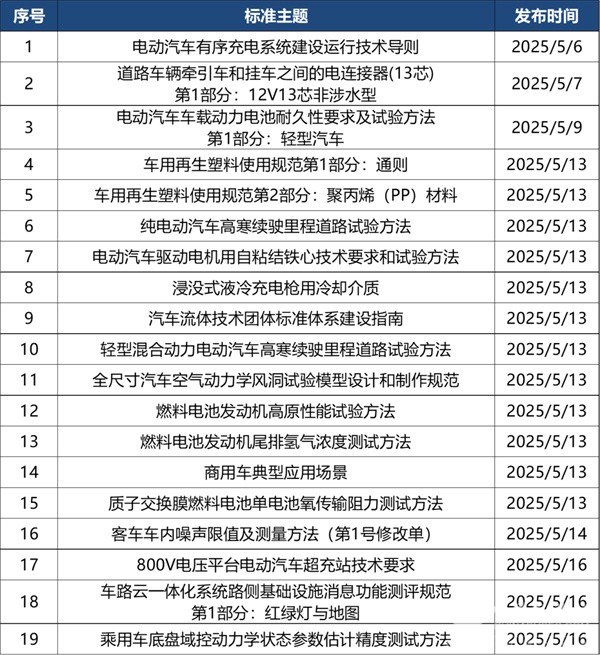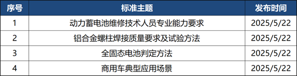 2025年5月共有定稿发布标准法规4部,涉及电池、商用车、工艺方面。详情如下: