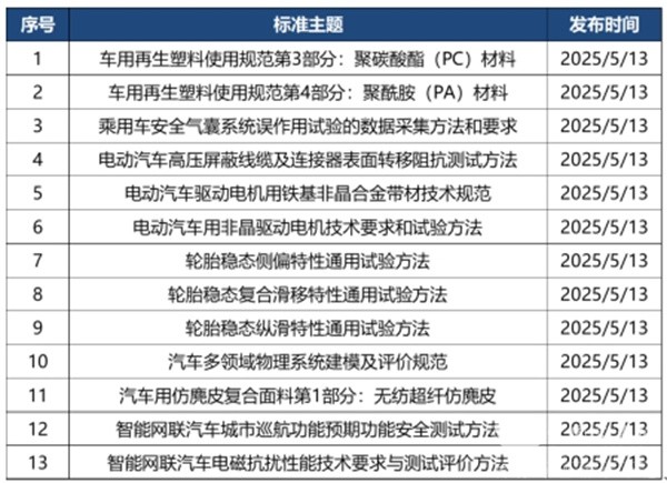 2025年5月共有新立项标准法规13部,涉及零部件、智能网联、材料、电气系统等。详情如下: