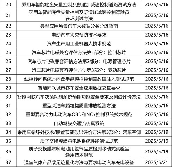2025年5月,共有37部标准法规征求意见稿,数量较多。涉及芯片、电气系统、材料、燃料电池、智能网联等。详情如下: