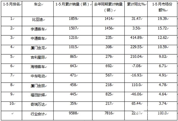 正是上述几个方面因素的叠加作用,导致今年5月新能源公交客车市场同环比呈现了较大幅度的增长。