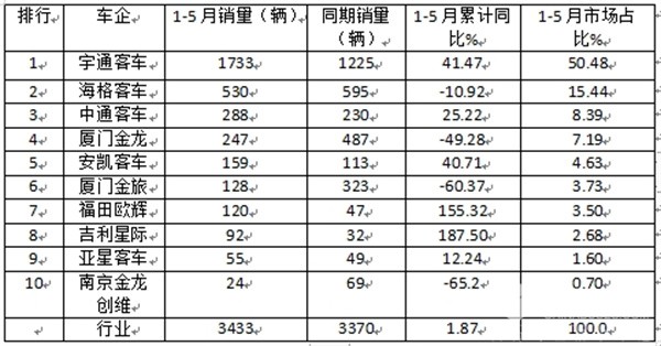 上图表显示,在2025年前5月大中型新能源座位客车前10车企累计销量中: