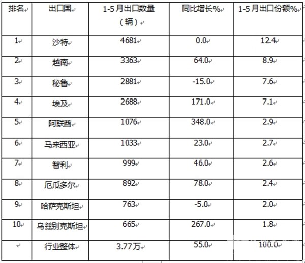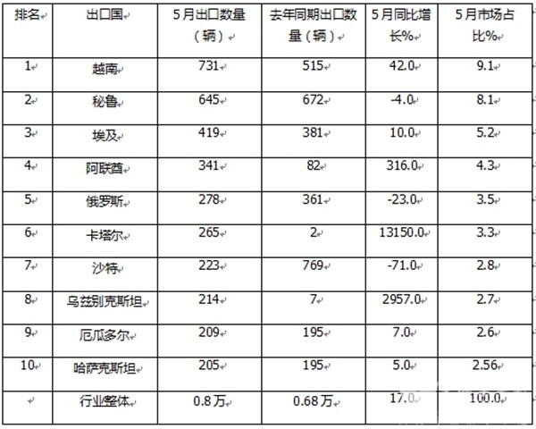 5月客车出口:越南\秘鲁\埃及居燃油车前三