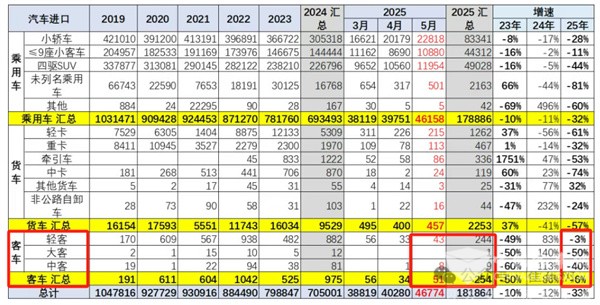 截图3,2025年5月及1-5月各种动力客车进口数量(数据来源:中国汽车流通协会)