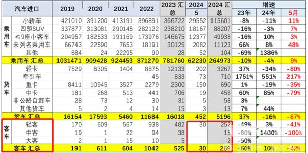 截图4,2024年5月及1-5月各种动力客车进口数量(数据来源:中国汽车流通协会)