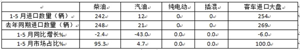 前5月我国客车进口:同比小降6% 轻客领跑领涨 柴油占比超9成