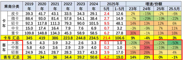 截图1,2025年5月及1-5月国内客车各细分市场销量及同比(数据来源:中国汽车流通协会提供的上牌信息)