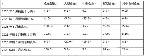 表1,2025年5月及前5月国内客车各细分市场占比(数据来源:终端上牌):