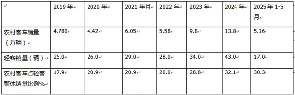表2,根据终端上牌数据,2025年1-5月及近年国内农村客车市场销量及占据国内轻客市场的比例统计如下: