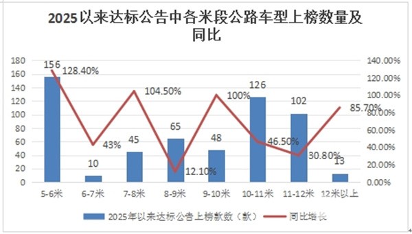 上图显示,在2025年以来的公路客车的达标车型公告中,5-6米段小型公路客车累计上榜156款,且同比增长128.4%,可见5-6米领涨领跑各米段车型。这无疑为今年以来国内农村客运市场(农村客运市场的主力车型为5-6米段)的增长提供了较强的产品力支持。