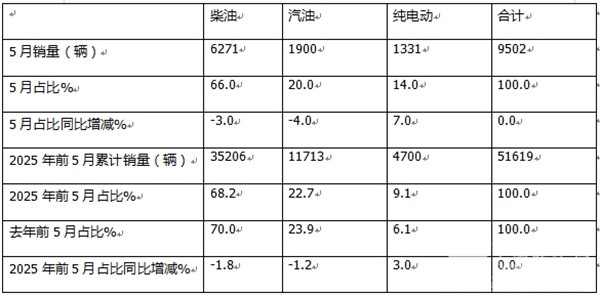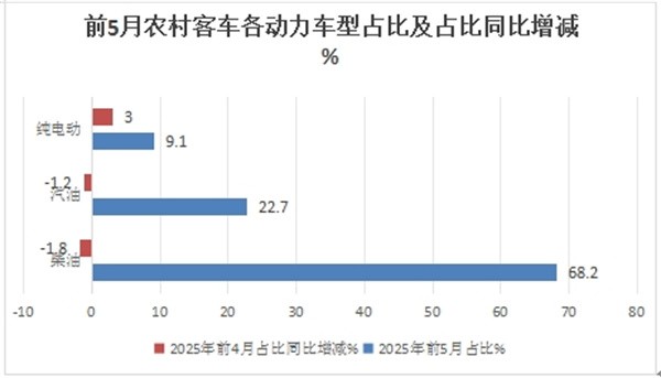---纯电动车型占比较小,分别为14个和9.1个百分点,但与2024年同期相比,占比同比分别增加了7和3个百分点,均是占比同比增加最多的细分车型,分别领涨2025年5月及前5月国内农村客车各动力细分市场。说明农村客车市场电动化进程同比明显提升。