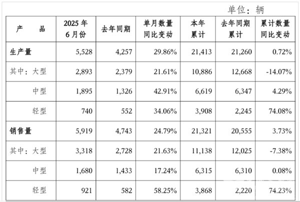 近日,中通客车发布了2025年6月份及上半年产销数据快报。