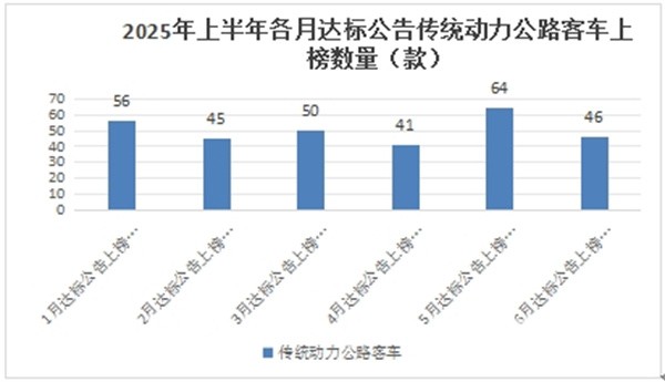 1、 2025年上半年各月交通部发布的道路运输车辆达标(公路客车)公告各动力车型上榜数量统计如下(数据来源:交通部)