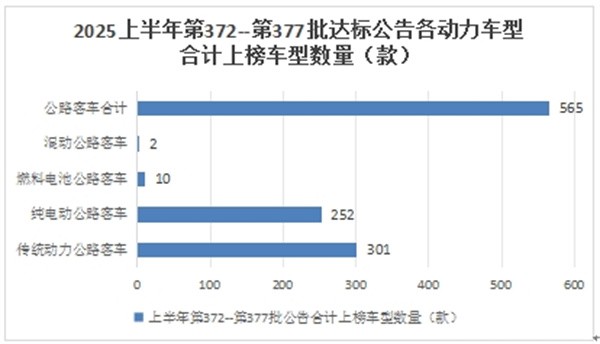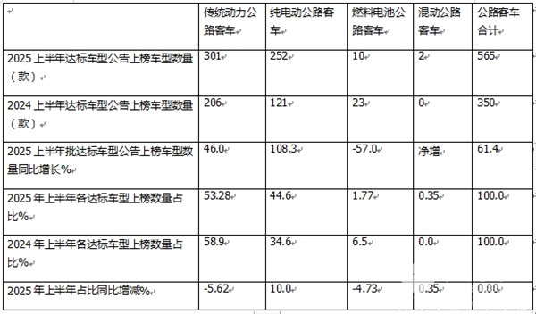 可见,在2025年上半年累计发布的6个批次公路客车达标车型公告中,传统动力公路客车仍占主体,但主体地位同比下降;纯电动公路客车表现最佳;燃料电池公路客车领跌,混动车型上榜数量最少。