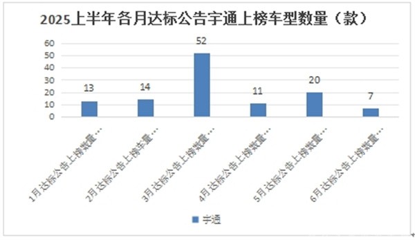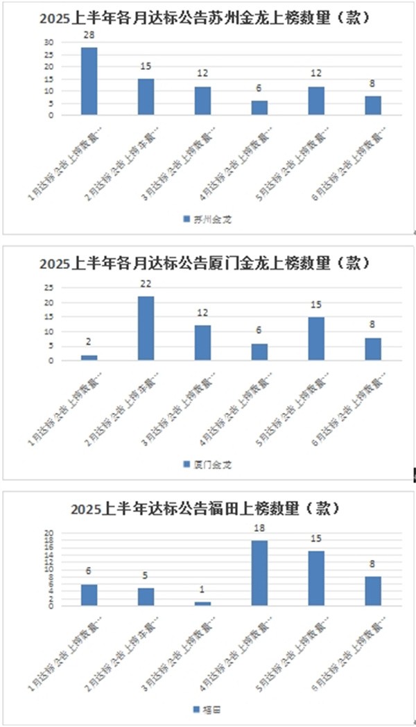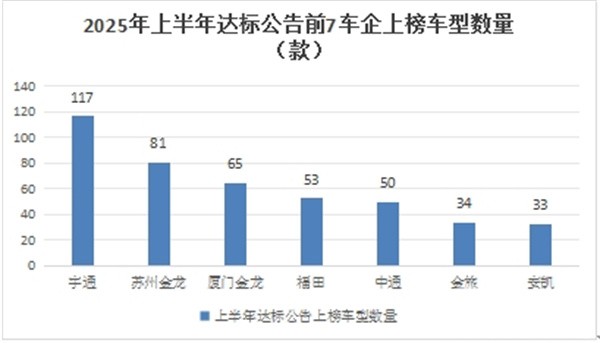 2、2025年上半年前7车企(两通三龙+福田+安凯)达标公告累计上榜车型数量统计(数据来源:交通部)