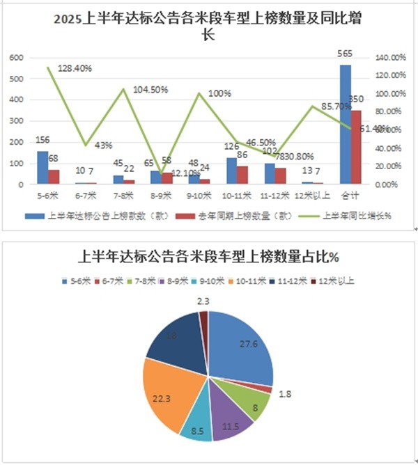 从上图表可见,2025年上半年公路客车达标公告中各长度段车型上榜数量同比及占比呈现以下突出特征: