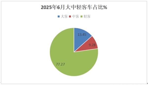 从占比看,大、中、轻客车占据2025年6月客车总销量的比例分别为13.45%、9.28%和77.27%;