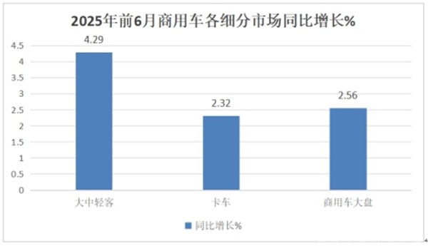 2025年前6月商用车累计销售212.16万辆,同比增长2.56%。其中2025年上半年大中轻客车累计销售26.52万辆,累计同比增长4.29%,也领涨今年前6月商用车大盘。