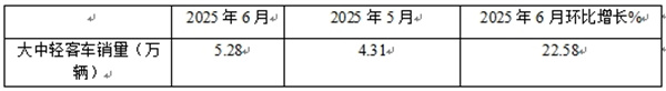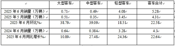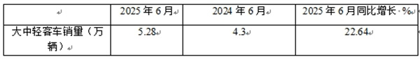 表1、2025年6月大中轻客车同比增长22.64%(数据来源:商用车专业委员会提供的批发信息):