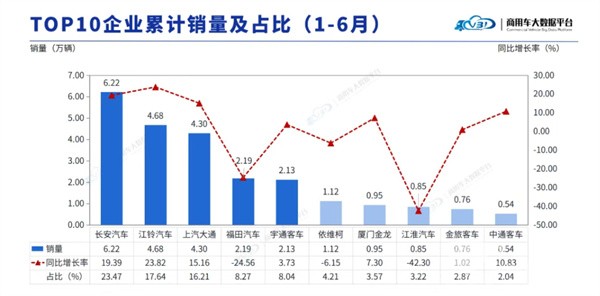 截图2,2025年1-6月大中轻客车前10车企销量、同比及占比(数据来源:商用车专业委员会)