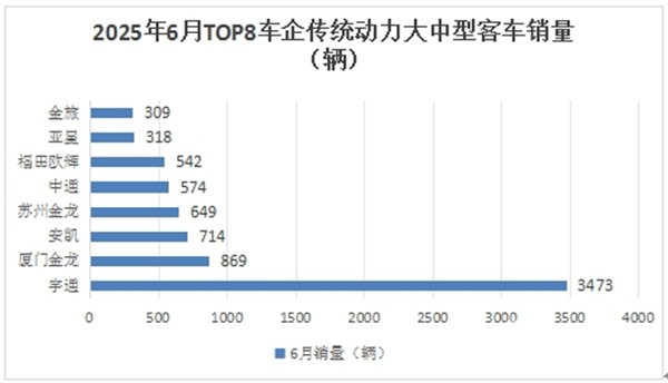 根据中国客车统计信息网数据,2025年6月6米以上传统动力客车销量top8排行(只统计销量在300辆以上车企)