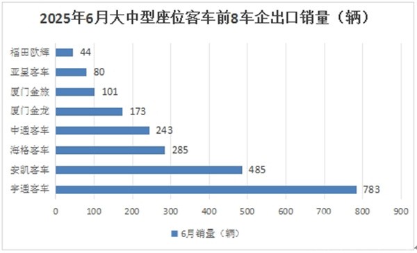 上图表显示,在2025年6月我国大中型座位客车出口市场前10车企中: