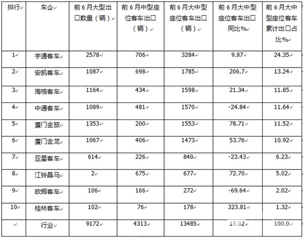 上图表可见,在2025年1-6月我国大中型座位客车出口前10车企排行中: