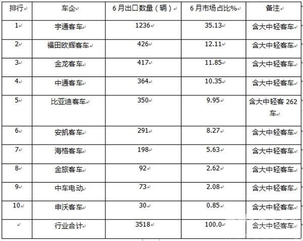 三、6月公交客车排行:比亚迪夺冠,宇通\中通分列二三