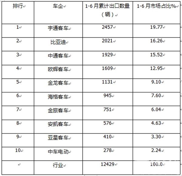 四、上半年公交客车出口:宇通\比亚迪均超2000辆领跑行业,中通居第三