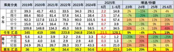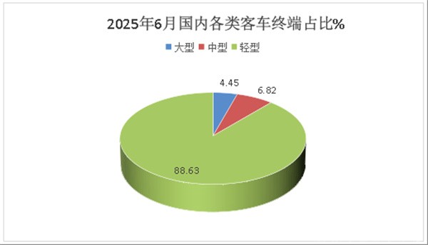 上表显示,在2025年6月国内大、中、轻客车终端销量及同比、占比中: