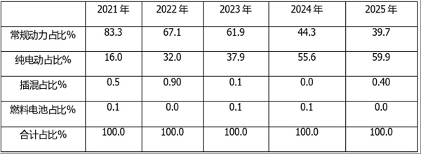 1、在2025年上半年客车整体市场,各技术路线新能源车型占比及占比同比增减:
