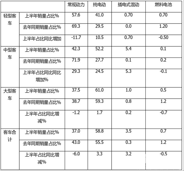 表3,近5年上半年客车各动力车型占比比较(数据来源:中国汽车流通协会提供的上牌信息):