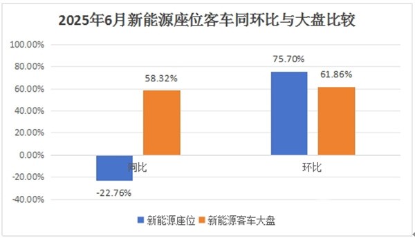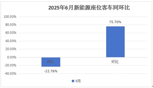 根据中国客车统计信息网数据,2025年6月我国大中型新能源座位客车同环比分别增长-22.76%和75.7%,而今年6月大中型新能源客车大盘同环比分别为58.32%和61.86%,可见今年6月大中型新能源座位客车同比及环比分别跑输和跑赢今年6月大中型新能源客车大盘。