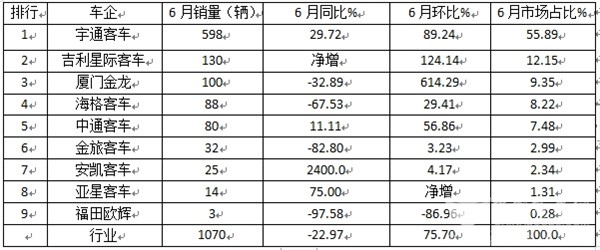 表1,根据中国客车统计信息网,2025年6月大中型新能源座位客车前9名车企(只有9名车企参与销售)销量排行及同环比: