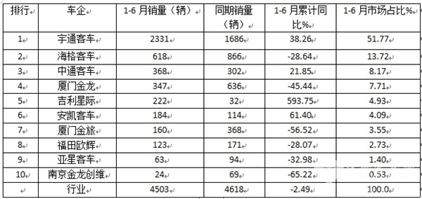 上半年新能源座位客车:销4503辆!降2.5% 宇通霸榜,海格\中通分列二三