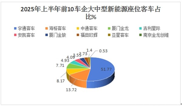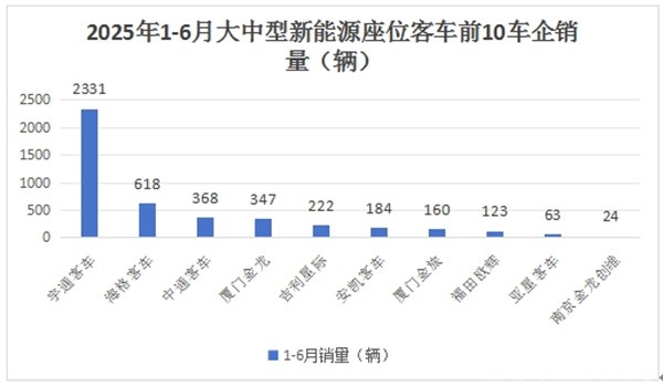 上图表显示,在2025年前6月大中型新能源座位客车前10车企累计销量中: