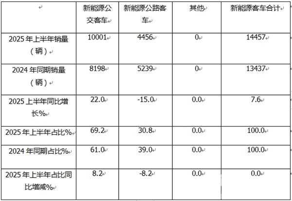 2025年1-6月新能源客车累计14457辆,累计同比(去年同期新能源客车终端累计销量为13437辆)增长7.6%。