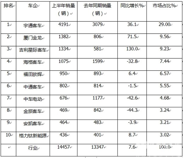 ---宇通客车累计销售4191辆,是唯一销量超过4000辆的车企,强势夺冠,同比增长36.1%,跑赢大盘;市场占比近3成(29%);表现抢眼;