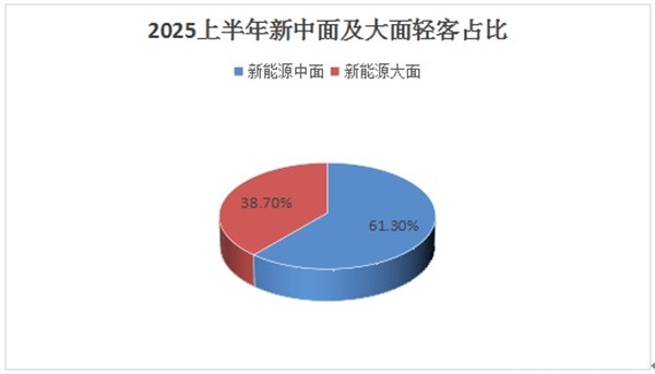 按米段车型划分,业内通常将新能源轻客可分为中面(含4.5米--5.5米新能源轻客)和大面(5.5米--7米新能源轻客)。其中中面车型2025年上半年累销销售7.4万辆,占据今年上半年新能源轻客整体销量61.3%的份额,处于新能源轻客市场的主体地位。