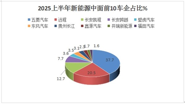 上两图可见,在2025年上半年新能源轻客中面市场中,五菱\远程\长安凯程居前三,特别是五菱汽车累销27913辆,是唯一销量超20000辆的车企,市场占比近4成(37.7%),可谓独占鳌头。