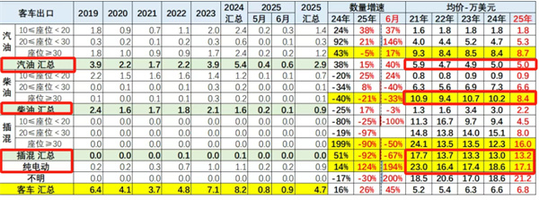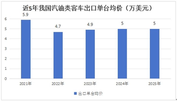 从汽油客车产品单台出口均价看,2025年上半年为5.0万美元,与去年持平,同前几年比较,差别也不大,可以说是基本趋稳。