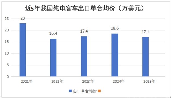 根据中国汽车流通协会提供的海关数据,2025年上半年我国纯电动客车产品累计出口0.9万辆,同比大涨124%,占据了今年上半年我国客车出口近2成的份额,也占据我国客车出口市场的第二席位(与柴油客车并列第二)。从纯电客车产品单台出口均价看,2025年上半年为17.1万美元,与2024年、2023年比较,分别下降1.5、0.3万美元,呈现稳中小降趋势。
