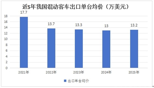 根据中国汽车流通协会提供的海关数据,2025年上半年我国混动客车出口单台均价为13.2万辆,与之前几年比较,基本处于企稳状态。