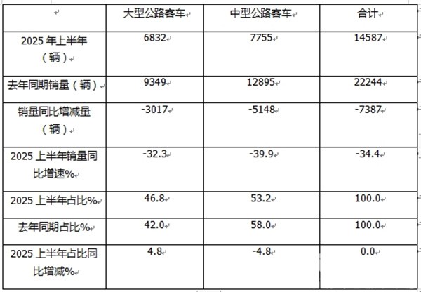 根据终端上牌数据,2025年上半年大中型公路客车累计销售14587辆(含6米以上车型,下同),同比(2024年同期大中型公路客车累计销售22244辆)下降34.4%,跑输2025上半年国内客车市场大盘1%的增速近35.4个百分点。