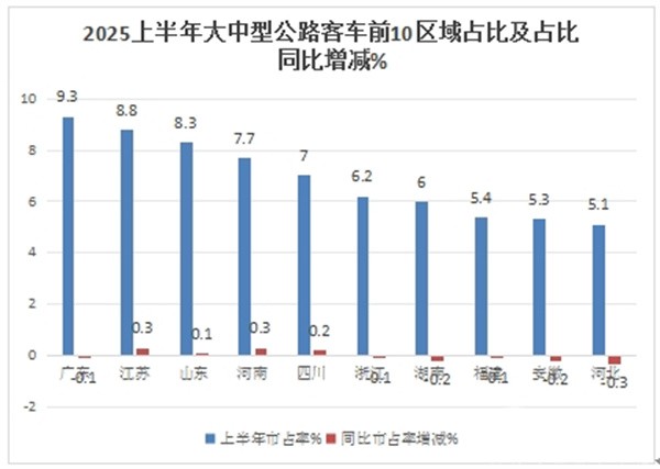 上图可见,2025年上半年国内大中型公路客车区域市场流向不均衡,主要扎堆在广东、江苏、山东等经济发达、高速公路较多的省份。TOP10中,市占率同比4增6降,累计占比近7成(69.1%),且同比减少0.3个百分点。垄断程度有微弱减少趋势。主要原因分析: