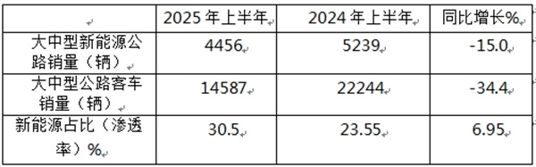 根据终端上牌数据,2025年上半年,大中型公路客车销量及同比、占比及占比同比变化: