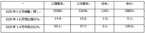 上表可见,在2025年1-6月5米以上公路、公交、校车三大细分市场中: