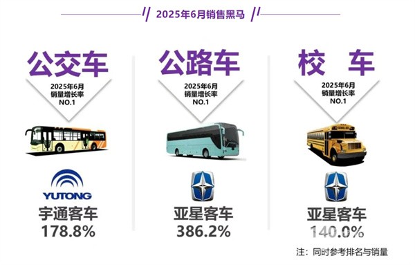 上表可见,在2025年6月5米以上公路、公交、校车三大细分市场中: